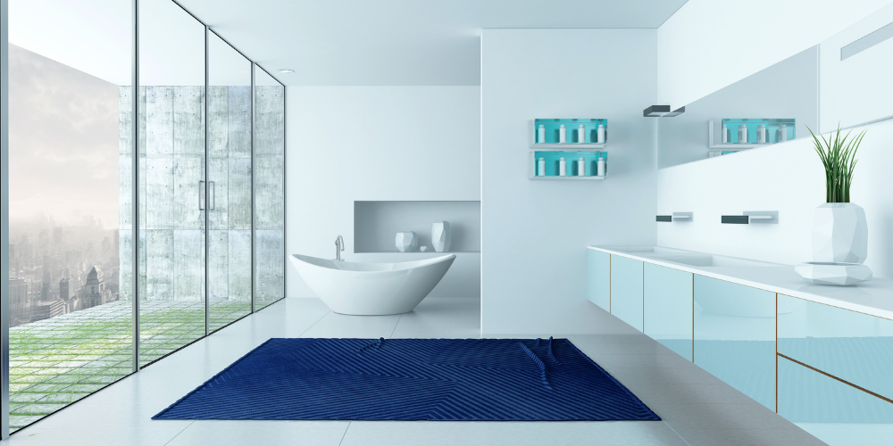 מערכת ישיבה שמזמינה שיחה עומדת בלב חלל הרחצה, צבעוניות בהירה ושמיימית פוגשת קשת גוונים עזה, קווים ישרים ניצבים מול קימורים ואלמנטים מעוגלים. כך תוכנן השנה