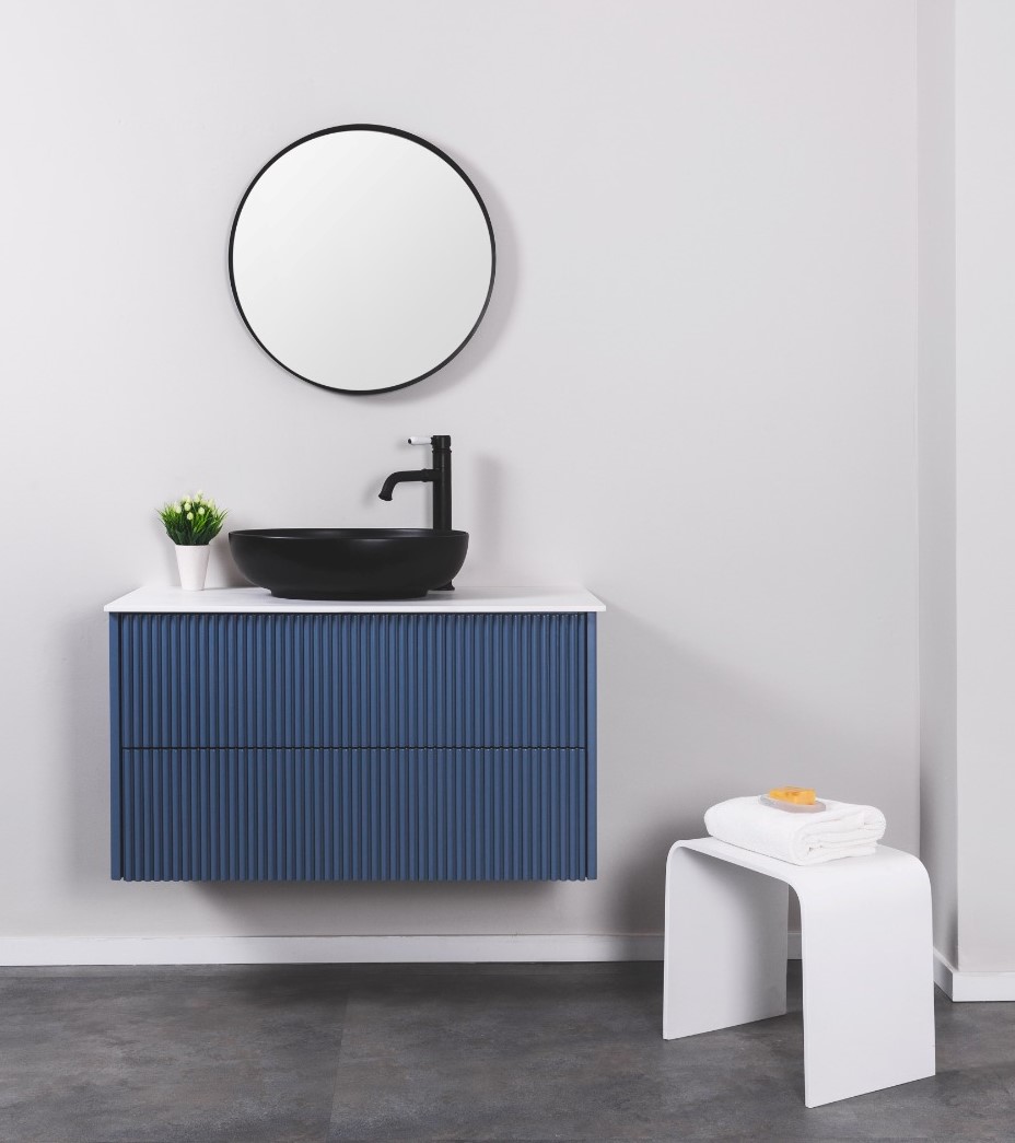 ארון מוניקה. ארון אמבטיה מרהיב ביופיו, בעל 2 מגירות, עם לחיצת טאצ' ללא צורך בידיות, בצבע כחול פסיפיק משגע • דגם ארון מוניקה הינו חלק מ'הטרנד המחורץ' שכבר ניתן לראות בפריטי ריהוט רבים ברחבי הבית
